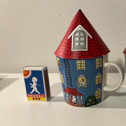 Muumitaloa muistuttava erinomaisessa kunnossa oleva Muumimuki myynnissä. Myös alkuperäinen katto mukana (on laitettu teipeillä tukevasti kiinni/suojattu).