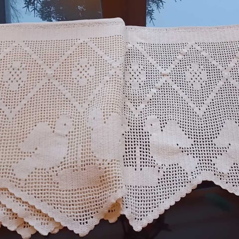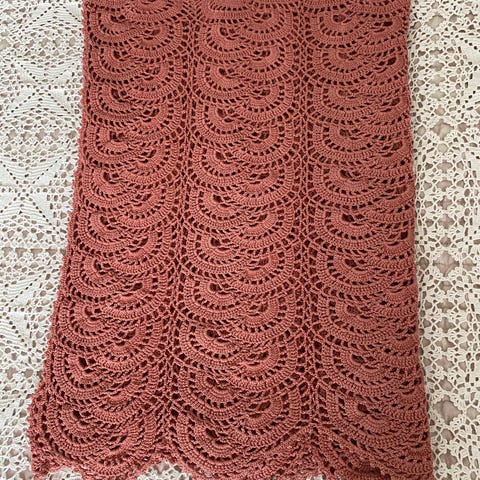 Kaunis virkattu kappa. Vaaleakeltainen. Kapassa kuviona lehmiä ja possuja. Siisti ja ehjä. Mitat on 280x78.