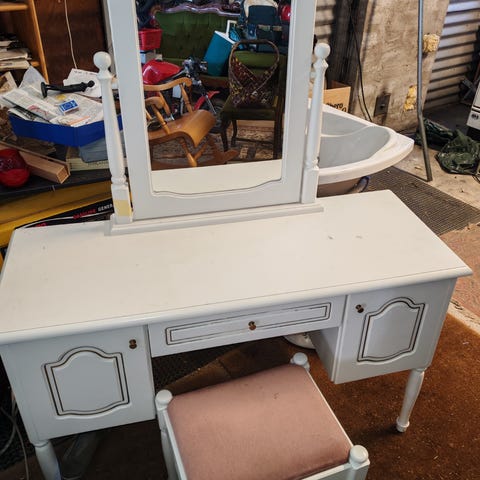 Kuvan peili / meikkipöytä lienee 50-luvulta. Tehty kokopuusta ilman mekanismeja laatikoissa.