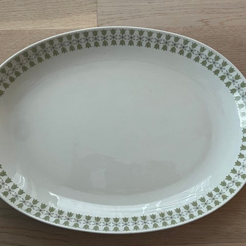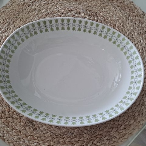 Malli AR, koristeen design Raija Uosikkinen, tuotannossa 1960 - 1970. Tarjolla oikein hyväkuntoinen tarjoiluvati, jonka pituus on 32 cm, leveys 23 cm ja korkeus 4 cm. Vati on täysin ehjä, vain hiukan lasitenaarmuja pohjassa, tosi siisti.