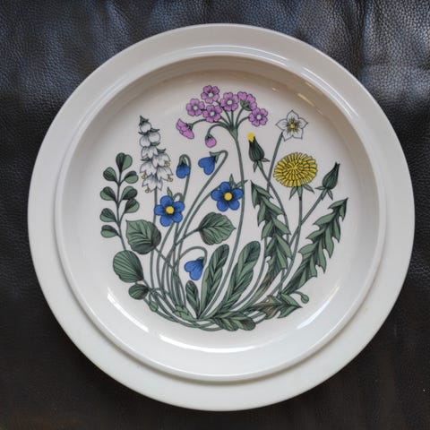 Esteri Tomulan suunnittelema tarjotin. Kuvassa esiintyvä viiru oikealla on lasitteen alla, pientä käytön jälkeä pinnassa ja vähän krakeloitumaa takapuolella, ei halkeamia eikä kirppuja.