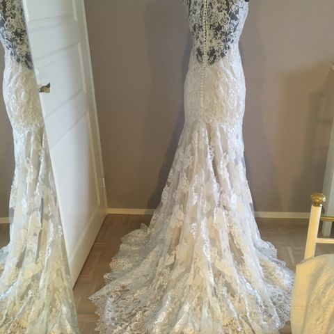 Myydään yhdet häät juhlinut pitsinen Ladybird-merkkinen A-linjainen hääpuku, mallinro 417011. Helmaa on lyhennetty 163 senttiselle, jolla oli hääpäivänä jalassa 7cm korot eli puvun pituus on noin 170cm + laahus. Helman alimman kerroksen reunaan on lisätty pitsinauha.