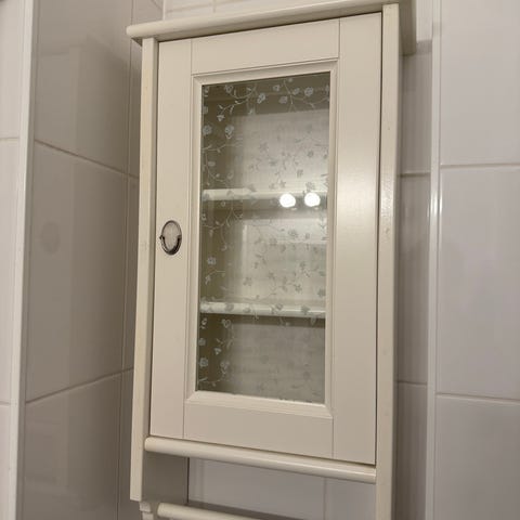 Kaappi on tummanruskea/lähes musta. Kaappi ei ole ollut kylpyhuoneessa veden kanssa kosketuksessa.