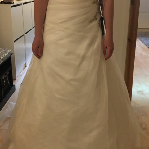 Stilissimasta ostettu Romantica -malli. Olkaimeton, satiininen, miehusta on upeasti kirjoiltu. Kirjoilu jatkuu epäsymmetrisesti alas hameosaan. Takana pieni (noin 80cm) laahus jossa samaa kirjoilua. Laahuksen saa ylös tanssin ajaksi. Tarkemmissa kuvissa näkee kirjoilun yksityiskohdat, huom otettu sisätilassa jossa on keltainen valo. Olen itse 169 cm, suht rintava, jalassa n 2 cm korot.