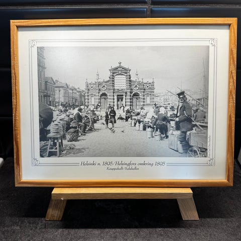 Vanha valokuva tai postikortti luultavasti 1900-luvun alusta tyylikkäässä viistehiotussa lasikehyksessä.