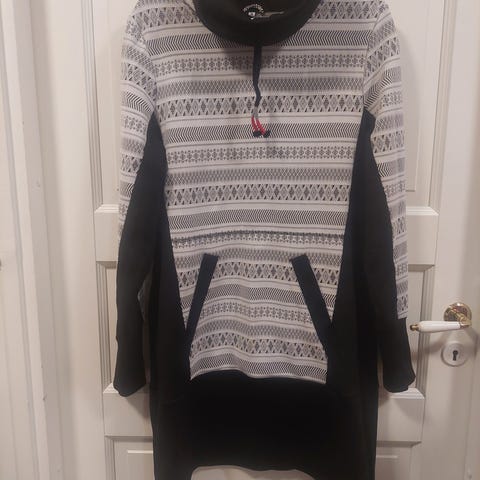 Valkoisella hartia huivilla oleva mekko. Valkoinen alaosa, musta-valkoinen yläosa.