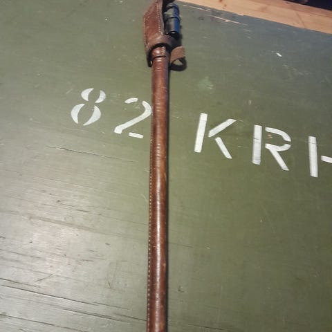 Sodan aikainen rotanhäntäpistin. Joku merkki ja numerosarja siinä näkyy.