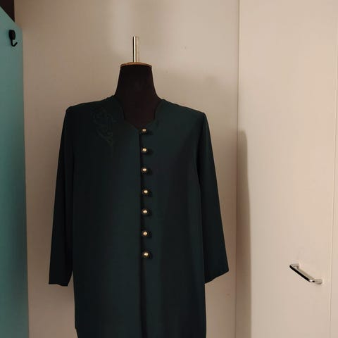 Sivutaskut ja vasemmalla pieni rintatasku. Edessä napit sekä hihansuissa koristenapit. Kainalo-kainalo mitta takaa on 58 cm. Kokonaispituus niskasta helmaan on 77 cm. Valmistettu Portugalissa.