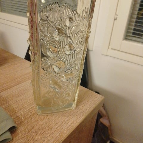 Kuvan mukainen lasinen vaasi, korkeus n. 37,5 cm, päältä n. 19,5 cm, jalka 12x12 cm, lasin paksuus n. 4-7 mm. Vaasi on kookas ja ylevän näköinen.