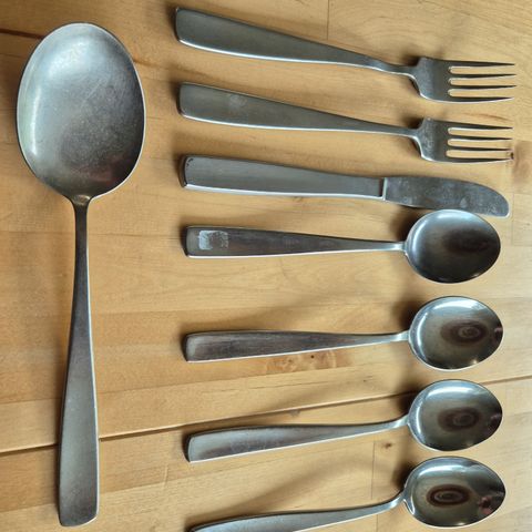 6 haarukkaa, 6 veistä, 3 lusikkaa, voiveitsi sekä juustoveitsi. Käyttämättömiä ja hyväkuntoisia.