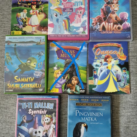 Disney filmit: Lumikki ja 7 kääpiötä, Kilpikonna ja jänis, Pieni merenneito, Pluton hipat, Prinsessa Ruusunen, Joulusuosikit