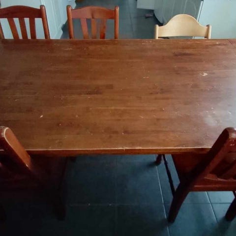 Tuolit päällystetty 5v sitten, alla ruskea ”sametti”. Pöydässä palojälki (kuvassa)