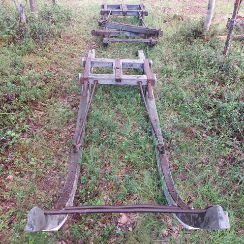 Kaksi metrinen reki jossa puujalakset. Moottorikelkalla vedettävä.