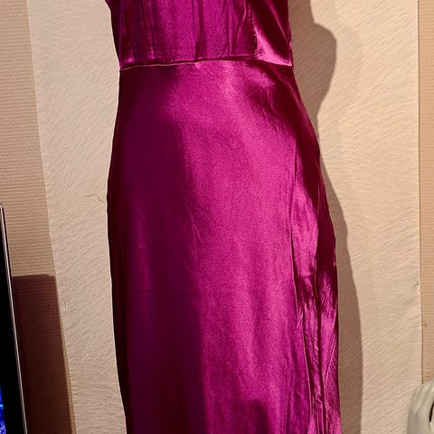 Kotimaisen STI -merkin juhlava, violetti mekko. Mekko on olkaimeton. Kangas kiiltää ja väikehtii kuin silkki, mutta materiaali on silkkiä helppohoitoisempaa, kauniisti laskeutuvaa polyesteriä. Mekossa on vuorikangas. Takana vetoketju ja hakanen. Helma on reilusti levenevä, joten malli sopii hyvin myös leveälanteiselle. Mekkoa on käytetty tyllialushameen kanssa, jolla helmasta saa muhkeamman. Tyllialushame ei kuulu kauppaan.