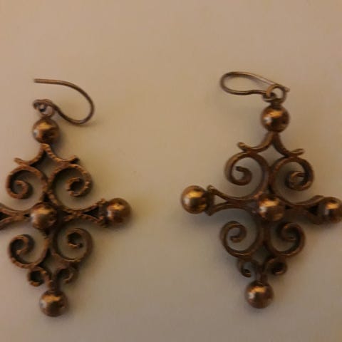 Näyttävännäköiset pronssikorvakorut kiinnitysklipseillä, joissa miellyttävä ( ei puristeinen) pitämistuntuma, mutta pysyvät silti napakasti korvissa.