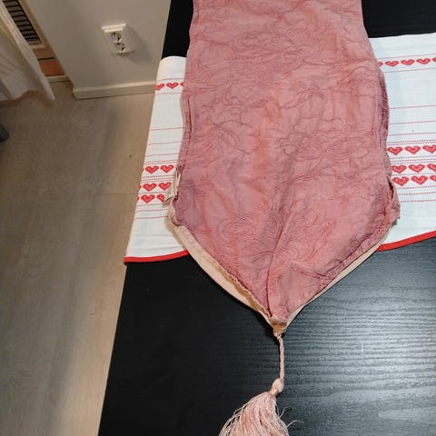 Roosa-harmaa paksuhko pöytäliina + persikanvärinen juhlaliina.