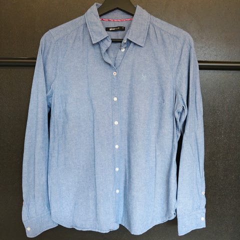 Gina Tricotin mintunvihreä, ohut ja läpikuultava pusero koossa 36. Nappikiinnitys. Rinnassa kaksi taskua. Hihoissa napit, joiden avulla hihoja saa käännettyä.