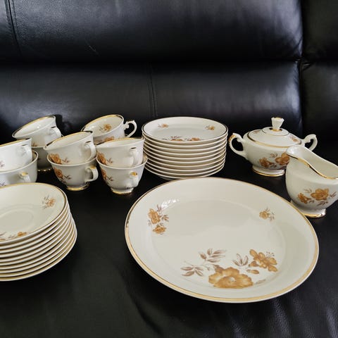 Kihlalahjaksi saatu enlantilainen kahviastiasto. Ei koskaan käytetty. 6 kahvikuppia aluslautasineen, 6 leipälautasta, sokerikko ja kermakko ja iso tarjoilulautanen. Kaikki tietenkin ehjiä ja naarmuttomia.