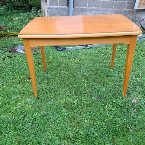 Valkoiseksi maalattu siisti ja hyväkuntoinen vanha puinen pöytä. Halkaisija 72 cm ja korkeus 67 cm.