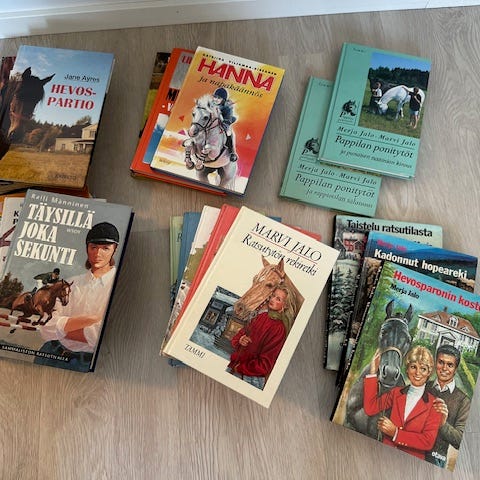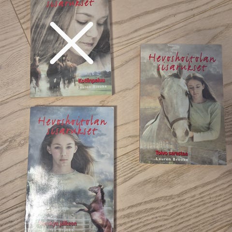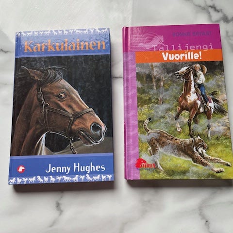 Hevoskirjoja 3 kpl. Yhden kirjan yksi kulma on taittunut. Muutoin kaikki heppakirjat ovat erinomaisessa kunnossa. Hinta yht. 5 € tai yksittäin 2 € / kpl.