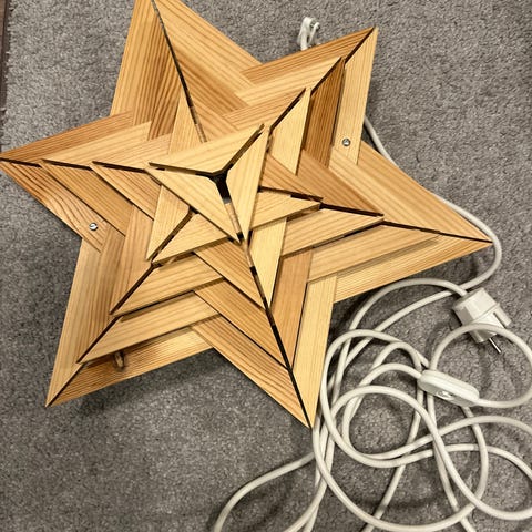 Myynnissä valkoinen iso ja tosi kaunis led-tähti. Koristetähdessä 30 kpl lämpimänvalkoista led-valoa. Päällystetty hopeoidulla puuvillalangalla. Mukana ripustuskoukku, sisäkäyttöön, toimii verkkovirralla. Tähden korkeus 40cm. Ei eläimiä, savuton koti. Nouto Seinäjoki tai Nurmo, kulkeutuu tarvittaessa myös Vimpelin suuntaan. Postin kulut lähetettäessä.