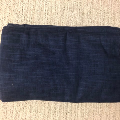 Upeat, pitkät sivuverhot. Ommeltu itse. Väri harmaaseen taittava sininen. Koristekuviot kiiltäviä, muuten verhoissa on himmeä hohto. Yhden verhon leveys on 120cm ja pituus 270cm. Toisessa päädyssä rypytysnauha.