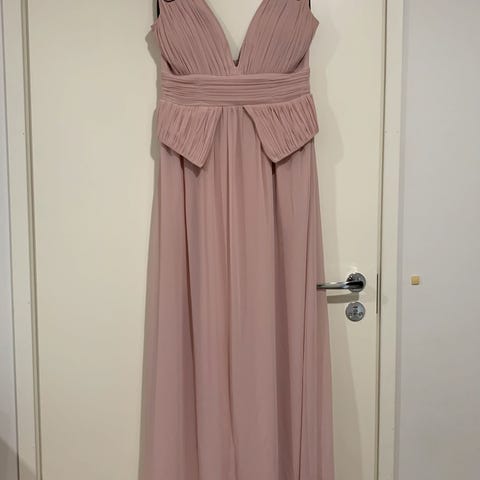 Olen käyttänyt mekkoa itse kahdesti vuosijuhlilla ja kerran häissä. Olen 172cm pitkä ja ilman korkoja mekko on minulle juuri sopivan pituinen. Jos mekon kanssa haluaa käyttää korkoja, tämä voisi olla sopiva hieman minua lyhyemmälle. Mekko on juuri pesty.