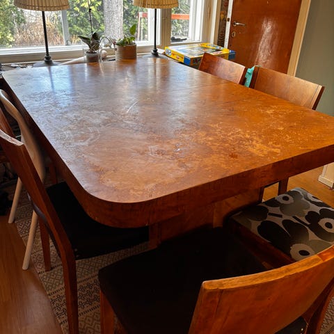 Kuvan erittäin hyvä Retro pöytä! Koivuviilua! Pituus 105, Leveys 55, Korkeus 61 cm! Tarjoa! Nouto tai tuon 1 Eur/km.