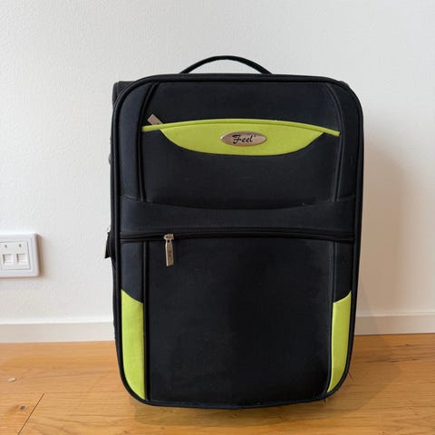 Vahvaa sisäpuolelta muovitettua kangasta. Edessä vetoketjulla varustettu kaksiosainen ulkotasku johon mahtuu useammat tai suurikokoiset jalkineet. Pituus avattuna keskeltä 112 cm, leveys 53 cm, ulkotaskujen syvyys pussin keskeltä mitattuna 45 cm.