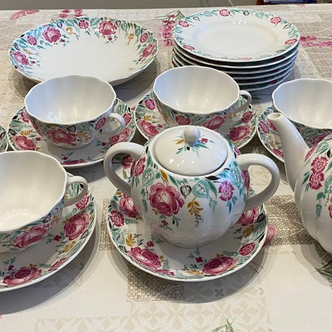 Setti on muuten ehjä, mutta lautanen on liimattu.