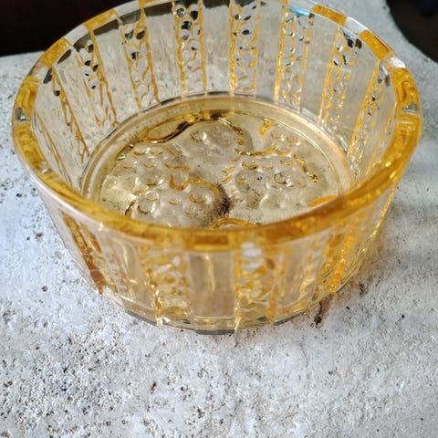 Mäntyharju lasi Lara. Moitteeton kunto. 1968-1971. Korkeus 8 cm. halkaisija 20 cm. suunnittelija Eero Rislakki. Metallinen pohjaosa 2 cm. 25 € nouto Akaa tai postit päälle 10.90 €