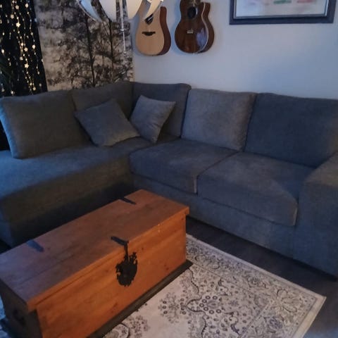 Harmaa kangasverhoilu, kauttaaltaan ehjä. Pientä pintakulumaa paikoin ja vähäistä nyppyä, ne on poistettavissa.