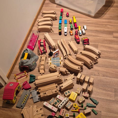 Pääosin Brion junarataosia, siltoja, risteyksiä, vetureita, vaunuja, taloja ym. Laatikko sisältyy hintaan.
