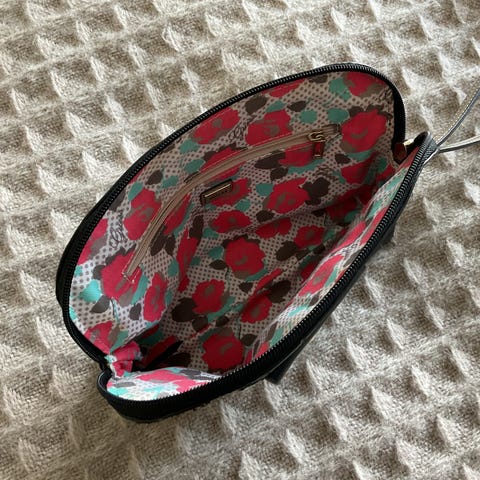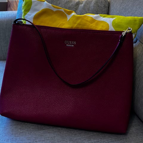 Totebag tyylinen laukku - väri tumma viininpunainen. Sisäpuolella kulumaa - vuoressa haalea tahra ja vetoketjun vieressä tekonahka kulunut. Ulkopuoli tosi siisti. Kahvoissa sisäpuolella kulumaa. Kts kuvat. Kunto huomioitu hinnassa