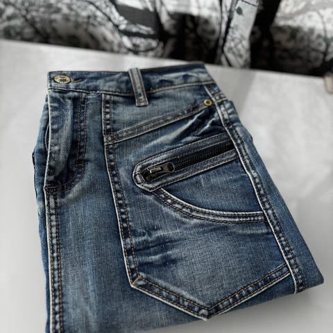 Farkkuhame, ajaton malli, edessä vetoketju ja napit, takana pieni halkio, pituus 55cm