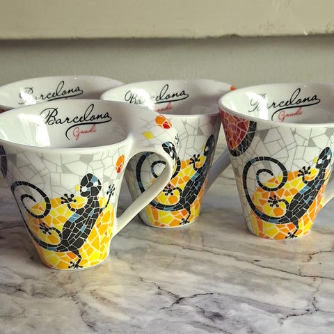 Antoni Gaudi/Espanja kuviolliset kahvimukit, korkeus 10cm 2 kpl hinta yhteensä 10 euroa, käytetty pari kertaa.