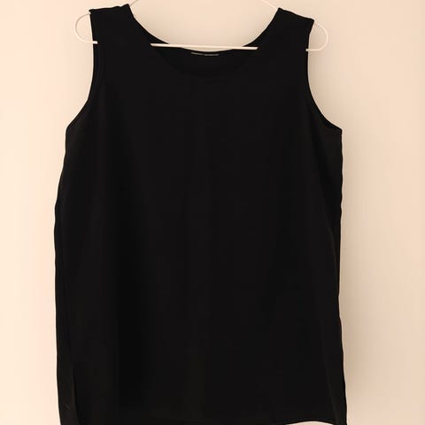 Musta naisten hihaton toppi ( L-koko ) Ei lappuja, mutta arviolta L-koko. Kainalo-kainalo 56 cm ja niska-helma 61 cm. Molemmilla sivuilla 10 cm pitkät halkiot. Materiaaliksi Veikkaan lycra-polyesteri. Joustavaa napakkaa materiaali. Erinomaisessa kunnossa.
