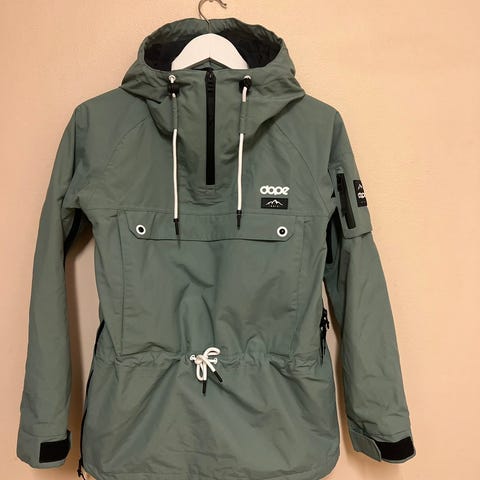 Uudenveroinen Dope Blizzard anorakki mm. lumilautailuun. Koko Xs (reilu). Tässä ei toppavuorta joten sopii pitkälle kevääseen. Tämä harvinainen vihreä väri myyty loppuun. Viimeisessä kuvassa väri näkyy parhaiten ulkona. Ovh 199 e.