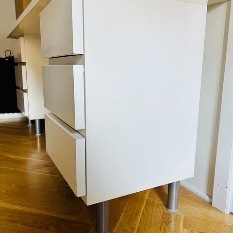 Laatikostoissa näkyvissä hieman kulumisen jälkiä, pöytälevyssä kahvitahra. Erityisesti laatikostojen päällä on näkyvissä kulumaa, mutta ne jäävät pöytälevyn alle piiloon.