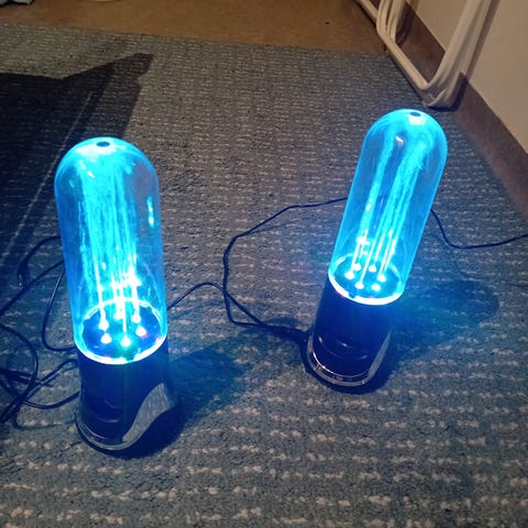 Tanssivat kaiuttimet vedellä ja vaihtelevilla värivaloilla. Vesi tanssii musiikin tahdissa.