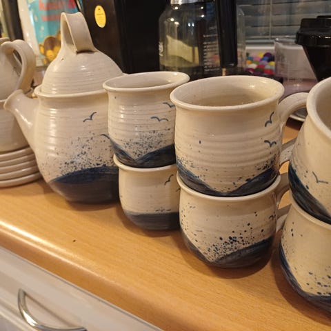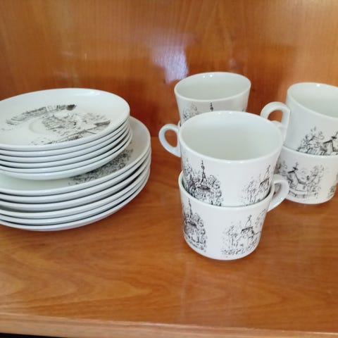 Savipaja Lintukodon keramiikkaa Lapualta. 6 kahvikuppia +asetit ja tarjoilulautanen. Postit ostajalle.