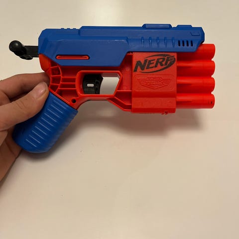 Kuvanmukainen Nerf pistooli. Pistooliin voi ladata neljä panosta, jotka ammutaan yksi kerrallaan latauksien jälkeen.