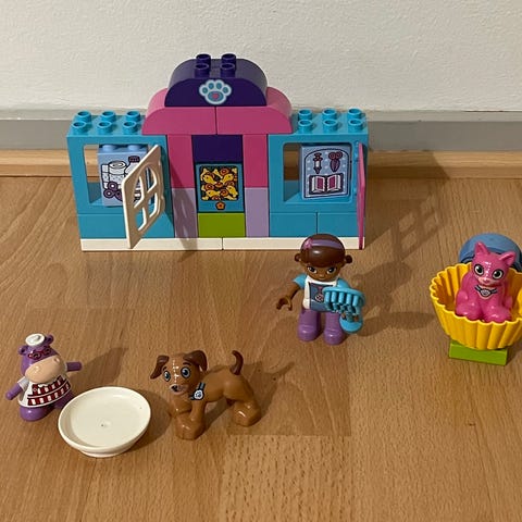 Tohtori on paikalla! Auta Doc McStuffinsia ja hänen ystäviään Lambieta ja Stuffyä hoitamaan leluja Takapihan klinikalla! Susie Sunshine on sairas ja tarvitsee Docin hoitoa tervehtyäkseen. Aika tarkistaa lääkärintarvikkeiden avulla, mikä on vikana. Lambie on apuna ja ojentaa viltin tai siteen, jos niitä tarvitaan. Erityinen kaksipuolinen palikka voidaan kääntää näyttämään Susie sairaana ja sitten, kun hän on parantunut. Kun Doc on saanut päivän työt tehtyä, on aika laskea liukumäkeä ystävien kanssa! Tämä LEGO® DUPLO® Doc McStuffins™ -setti tarjoaa pienille lapsille loputtomia leikkimahdollisuuksia leluja hoitaen. Samalla setti edistää rakentamisen perustaitoja klinikan rakentamisen ja uudelleenrakentamisen kautta. Mukana on 1 LEGO® DUPLO® hahmo: Doc McStuffins ja stetoskooppi sekä Lambie ja Stuffy.