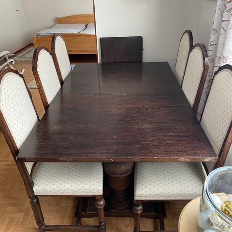 Ryhmän pöytä on ehjä ja hyvässä kunnossa,lukuunottamatta jälkiä pöytälevyssä.(niistä kuvat)