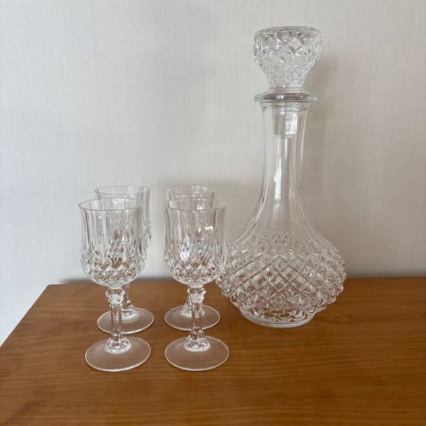 Seitsemän lasia ja patenttikorkillinen karahvi/pullo kaupan päälle. Pullossa hieman käytön jälkiä sisällä ja korkki hieman löysä. Ei säröjä tai lohkeamia. Lasi korkeus 13,5cm ja suuaukko 8cm. Pullon korkeus 32cm. Nouto Saimaanharjulta 10km Lappeenrannasta. Voin postittaa mutta postikulut sinulle