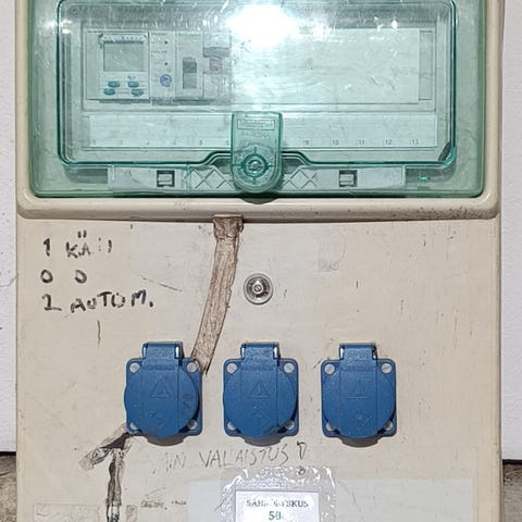 Sininen sähkökaapelikela, jossa useita pistorasioita ja maadoitettu pistotulppa. Kela on metallisessa telineessä, joka pitää kelan pystyssä ja helpottaa siirtämistä. Soveltuu esimerkiksi tilapäiseen sähkönjakoon sisä- tai ulkokäytössä käyttöohjeiden ja turvallisuusmääräysten mukaisesti.