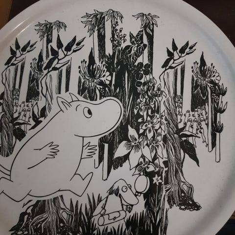 Vähän käytetty mustavalkoinen Muumi Seikkailu tarjotin.