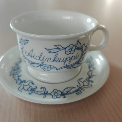 Arabia Sininen sarja Äidinkuppi. Kupin korkeus 6,5 cm ja lautasen halkaisija 14,5 cm.
