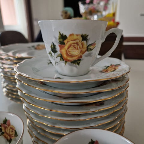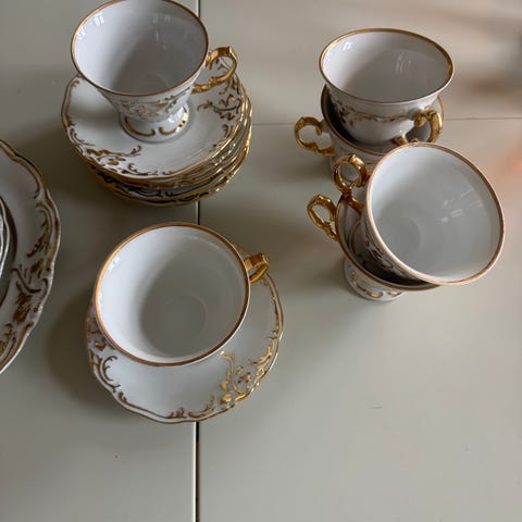 Upea, uniikki käsinmaalattu 12 hengen kahviastiasto. Sisältää kahvikannun, kermakon ja sokerikon.