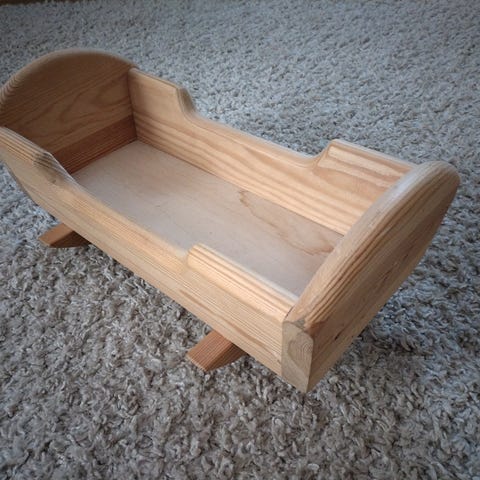 Vanha turkoosin värinen nuken kehto. Pituus 52,5cm, leveys noin 23,3cm